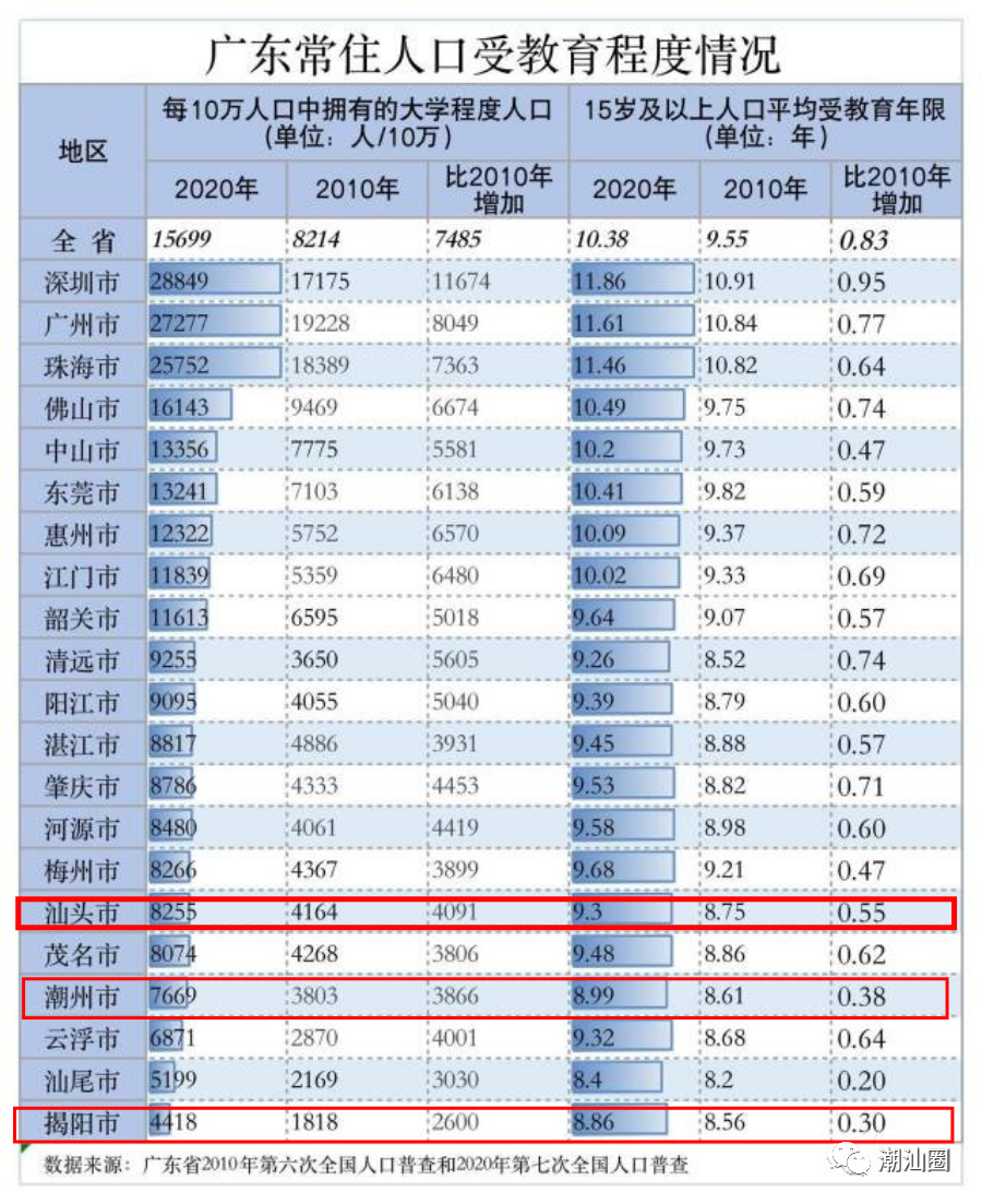 据公报显示:潮汕三市(汕头、潮州、揭阳)2020年末常住总人口数为13648232人。汕头:2010年为5391028人,2020年的人口数为5502031人,十年增长率为2.06%。潮州:2010年为2669844人,2020年的人口数为2568387人,十年增长率为-3.80%。揭阳:2010年为5877025人,2020年的人口数为为5577814人,十年增长率为-5.09%。潮汕三市,男女性别比分别为:汕头,101.85;潮州103.44;揭阳104.68。而全省平均为113.08。汕头15-59岁人口,占比达到62.2%。0-14岁人口占比也达到22.28%。60岁数以上人口占15.52%。潮州15-59岁人口,占比达到61.53%。0-14岁人口占比也达到19.3%。60岁数以上人口占19.17%。揭阳15-59岁人口,占比达到58.36%。0-14岁人口占比也达到25.53%。60岁数以上人口占16.11%。从常住人口的受教育程度看,汕头、潮州、揭阳每10万人口中拥有的大学(指大专及以上)文化程度的人口分别为8255人、7669人、4418人,15岁及以上人口平均受教育年限分别为9.3年、8.99年、8.86年。汕头是沿海经济带东翼地区中最有文化的城市,但潮汕地区受教育程度整体排名靠后。此外,从城乡人口看,广东全省城镇人口为9344万人,占常住人口的74.15%,比2010年提高7.97个百分点。